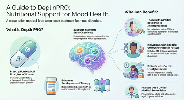 Mood disorders in children, adolescents, and adults are complex and often influenced by biology, genetics, lifestyle, and medical factors. While antidepressant medications such as SSRIs and SNRIs are commonly prescribed, some patients experience only partial relief. In these cases, targeted nutritional support may play a valuable role. DeplinPRO Mood Health™ is a prescription medical food designed to support neurotransmitter synthesis and overall mood regulation when used under medical supervision.